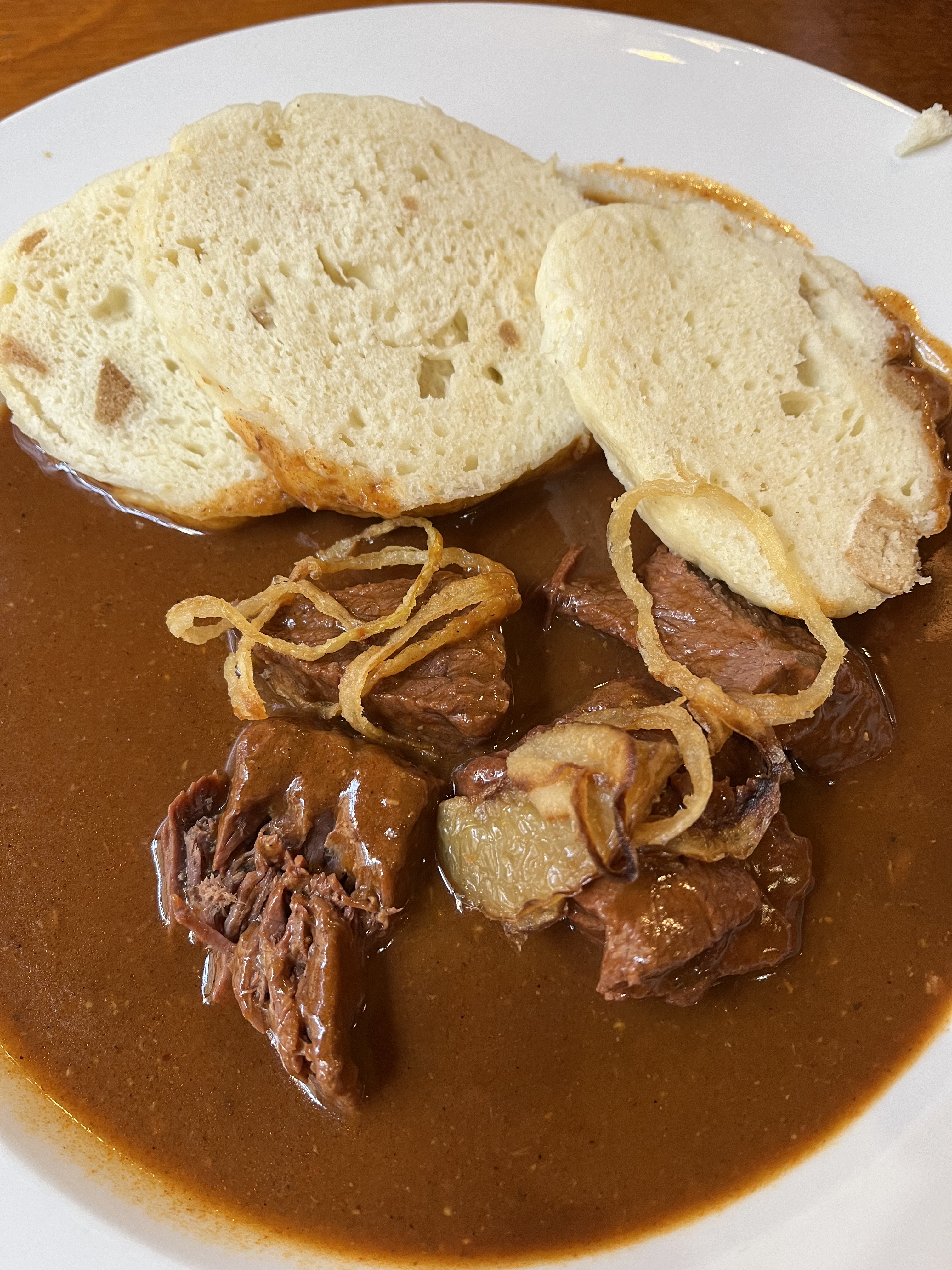 Cafe Savoy ve Cafe Imperial sabah ve öğlen saatlerinde yoğun oldukları için rezervasyon yaptırmadan gitmeyiniz. La Degustation Bohême Bourgeoise Michelin yıldızlı bir restoran öğlen 11:30-13:30 ve akşam 18:00-24:00 saatlerinde rezervasyonlu olarak gidebilirsiniz. Bunun dışında QQ Asian Kitchen pazar günleri kapalı diğer günler 17:00-23:00 saatleri arasında hizmet vermektedir. Hemen üstünde yer alan MOSAIC HOUSE Design Hotel konaklamak için güzel bir yerdir. Lokal tatları tatmak için ise Lokál Dlouhááá ve Lobkowicz Palace Restaurant & Café gidebilirsiniz. Aşağıda iki farklı Gulaş örneğini de görebilirsiniz.