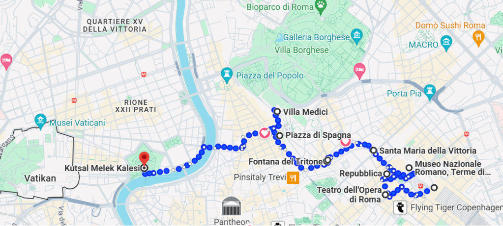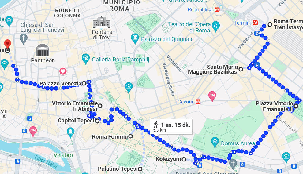 Roma şehri çok büyük bir yerleşke içerisinde yer aldığı için konaklayacağınız bölge üzerinden günlük olarak yürüyüş rotalarınızı oluşturmanız gerekmektedir. Her kişinin istekleri farklı olduğu için kendi rotalarımı ve gezebileceğiniz noktaları paylaşacağım.