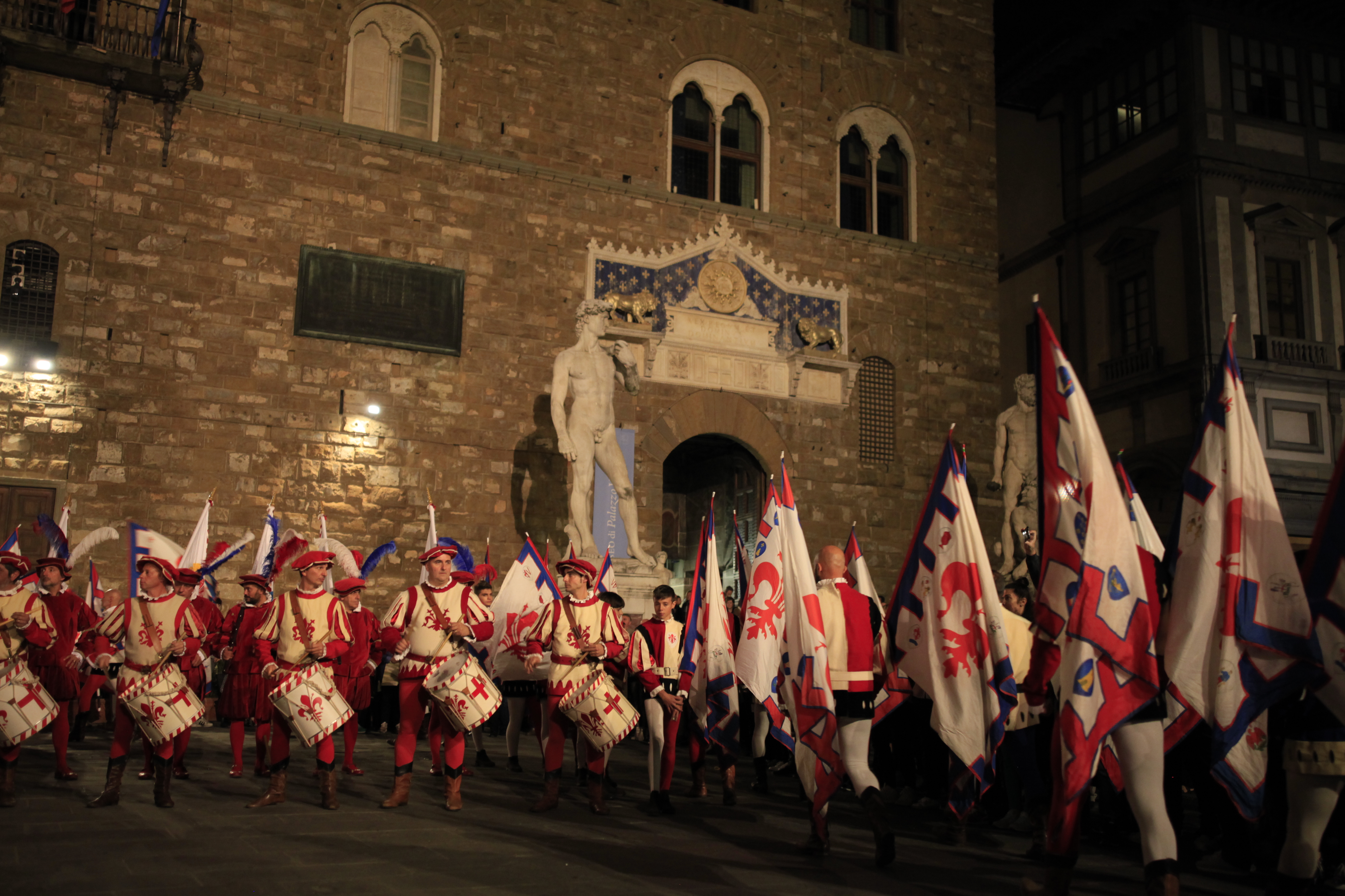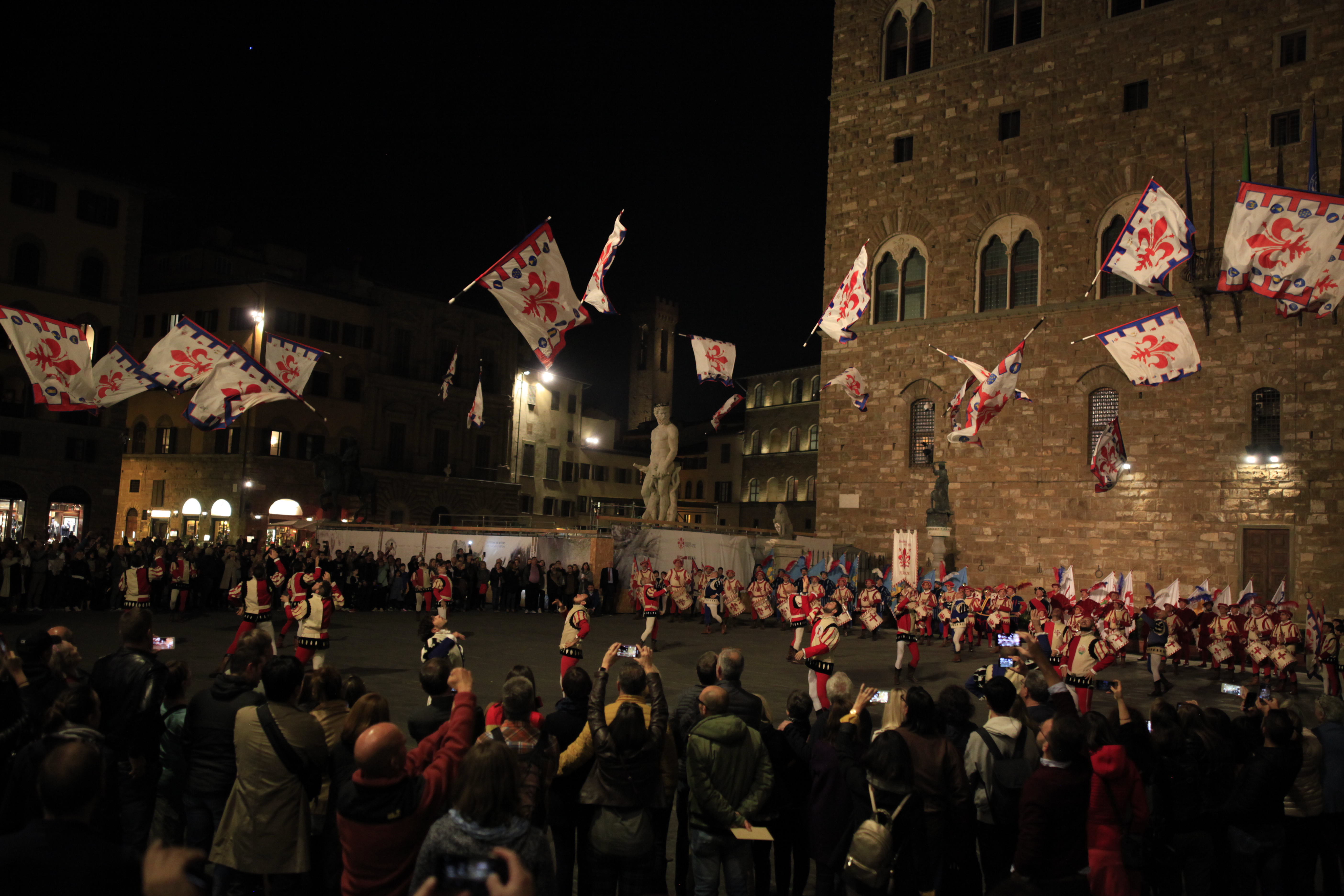 Signoria Meydanında Ekim ayında akşam saatlerinde gezerken festivale rastladık ve çok güzel tarihi bir gösteri izledik. Dönemsel kıyafetleriyle ellerindeki flamaları en yukarıya fırlatıp sonrasında tutan, davul ritimleriyle meydanı sesle dolduran tarihi bir gösteriydi.