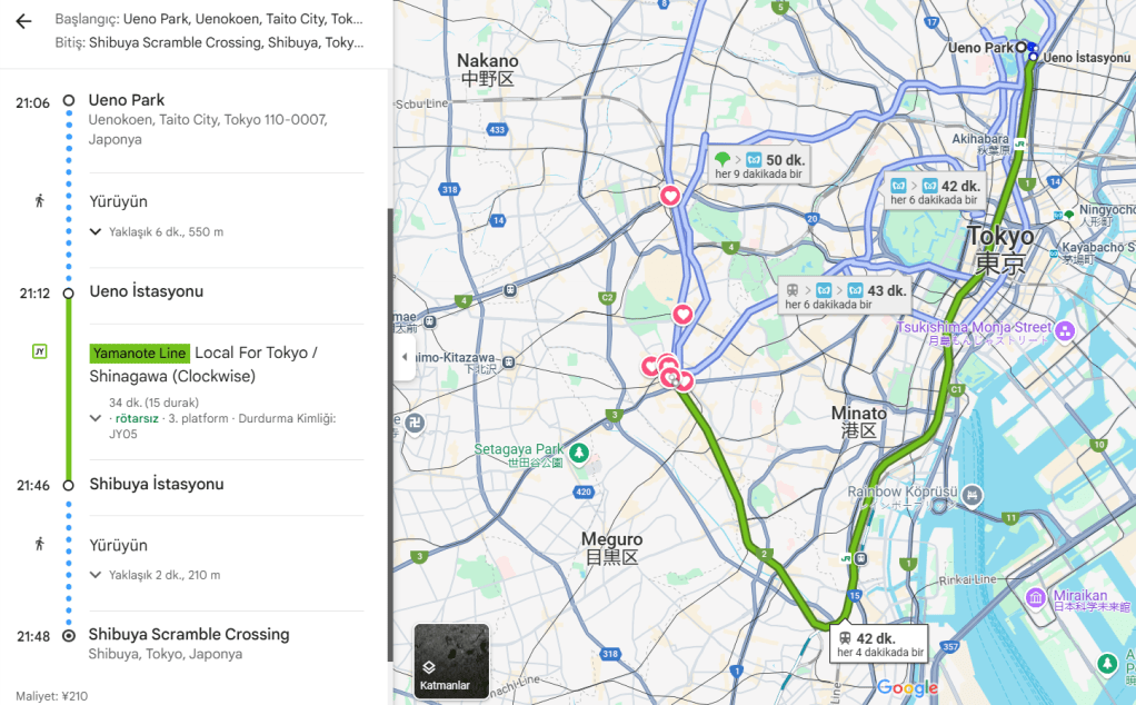 Tokyo, Japonya’nın en büyük yerel ve uluslararası demiryolu ve kara taşımacılığı merkezidir. Tokyo’daki toplu taşıma, çeşitli operatörler tarafından işletilen kapsamlı bir tren ve metro ağı tarafından yönetilir. Tokyo’da 62’ye kadar elektrikli tren hattı ve 900’den fazla tren istasyonu vardır. Metro hatları çok karışık olarak görünse de aşağıdaki ekran görüntüsünde gördüğünüz Google Haritalar ile gideceğiniz noktaları seçebilirsiniz. Bu sayede hangi istasyondan binmeniz gerektiğini bulabilirsiniz. Ayrıca ineceğiniz istasyona olan uzaklığı ve sol alt köşede ödeme yapacağınız tutar bilgisini görebilirsiniz. Bilet makinelerinde ingilizce seçeneğini değiştirdikten sonra gideceğiniz istasyon ismi ile bilet alabilirsiniz. Burada dikkat etmeniz gereken husus ise farklı tren hatlarıyla gitmeniz gereken yerlerde gideceğiniz istasyonu bulamazsanız, sol alt köşede yer alan maliyet tutarına bakarsanız ve ilgili tutardan az olmamak kaydıyla bilet alabilirsiniz. Ayrıca aldığınız bileti çıkarken de aynı şekilde okutmanız gerekiyor yoksa bilet görevlileri ceza veyahut aradaki farkı ödemeniz gerektiğini söyleyeceklerdir.